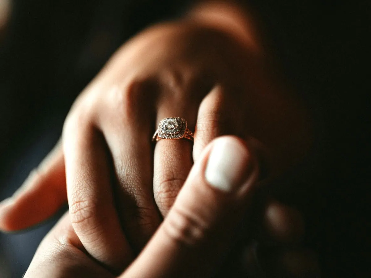 Segurando mão de noiva que está com anel de noivado halo - quais são os anéis por fase do relacionamento?