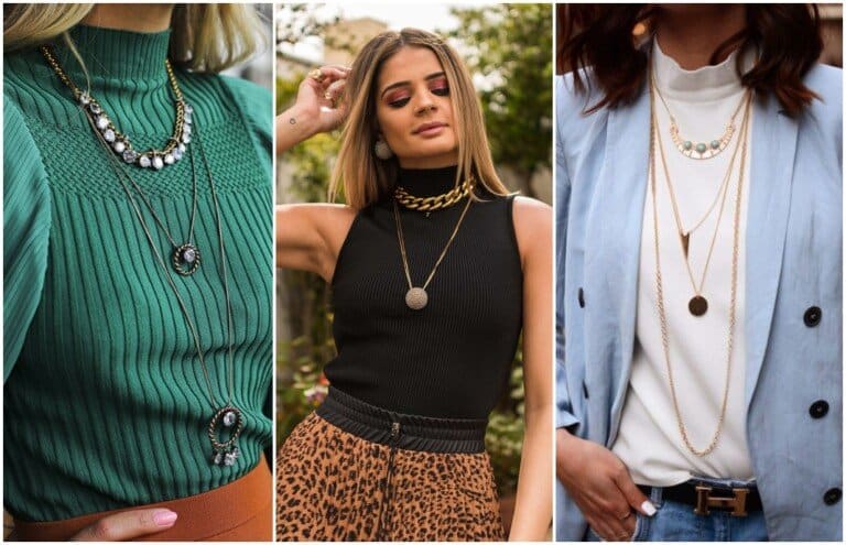 Além disso, existem colares que valorizam ainda mais a gola alta, por exemplo, os colares de corrente, os mix de colares com pingentes menores e os compridos até na altura do seio.