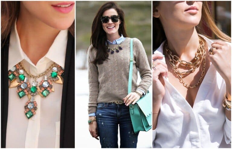 Para deixar o look mais formal, o ideal é um colar de pérolas. Enquanto isso, os colares com pedrarias tem o poder de deixar a camisa com um ar mais informal.