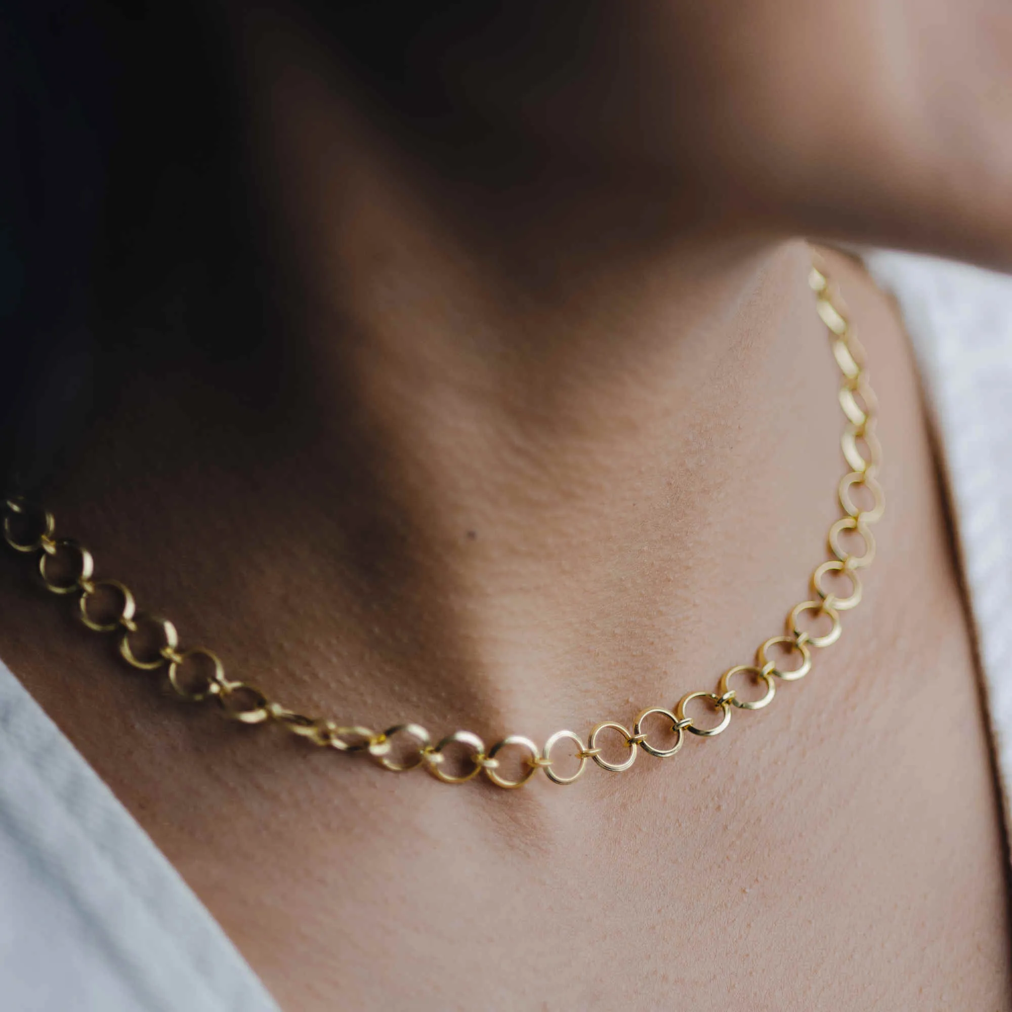A chocker, como seu nome em inglês indica, é um colar que é mais grudado no pescoço.