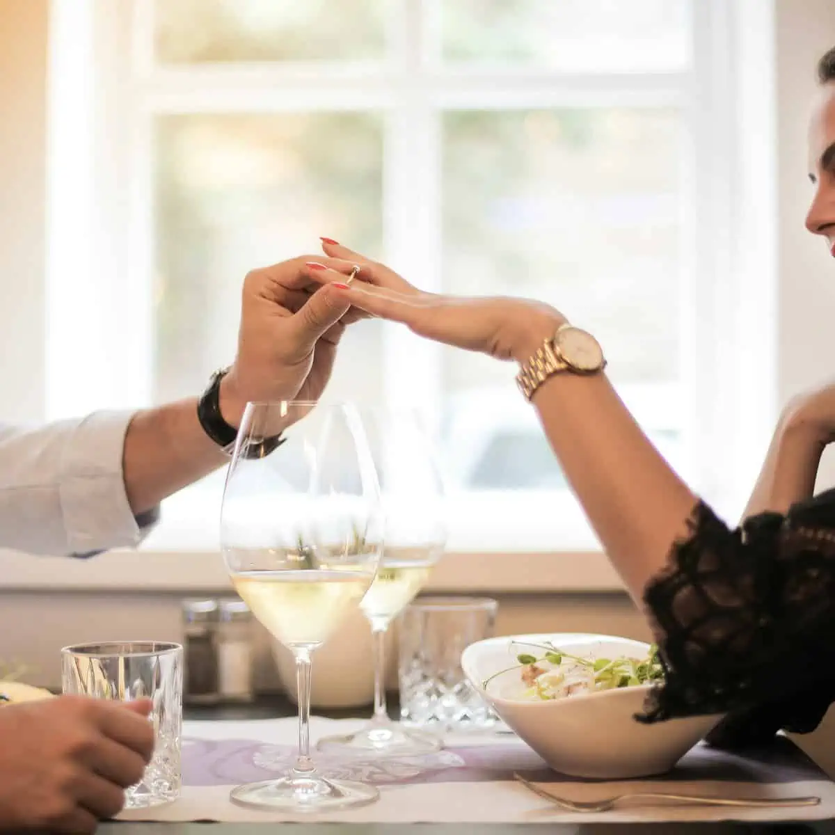 O jantar romântico é uma ótima opção para a entrega das alianças, você pode realizar uma reserva em um restaurante que o casal goste.