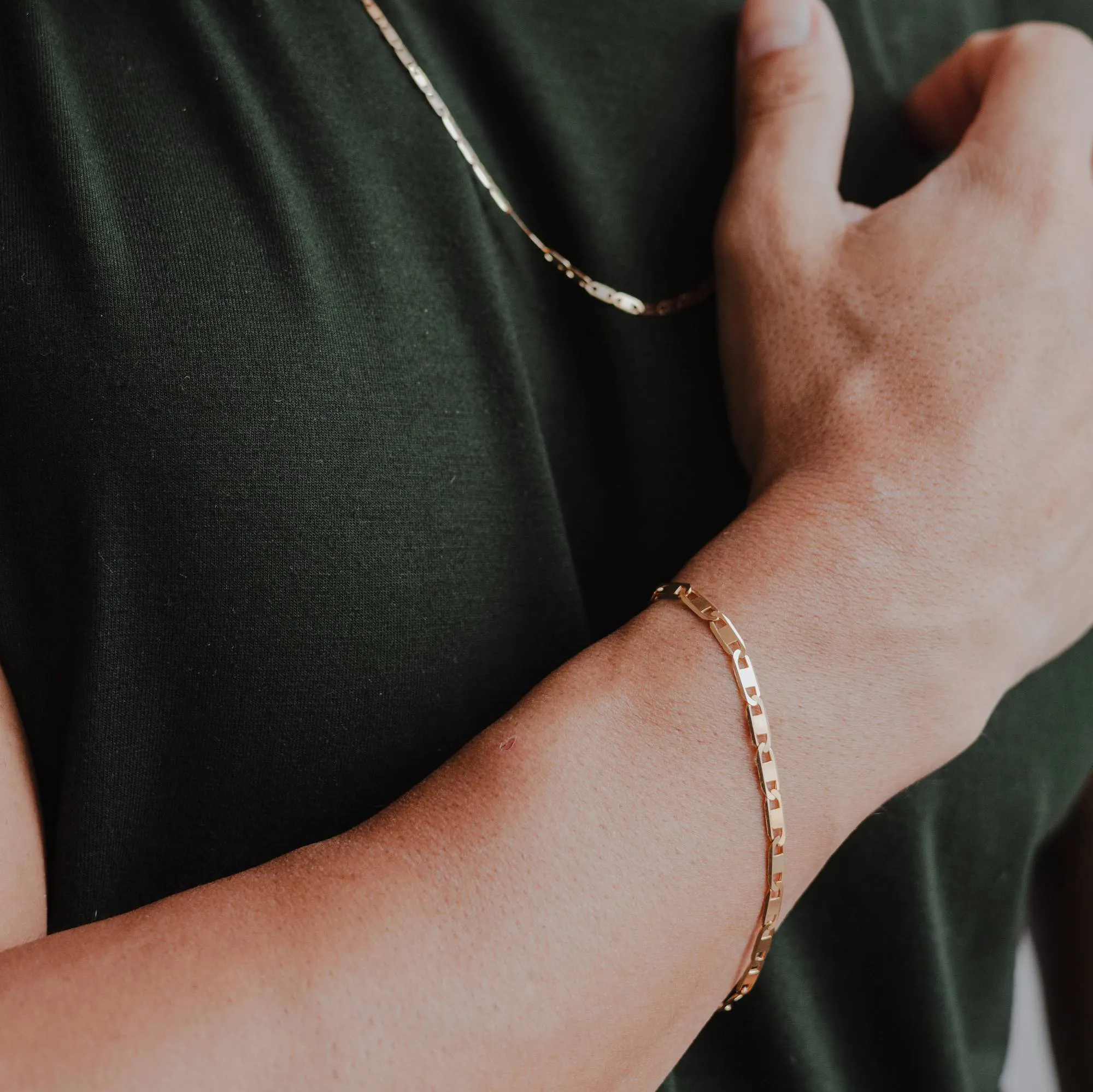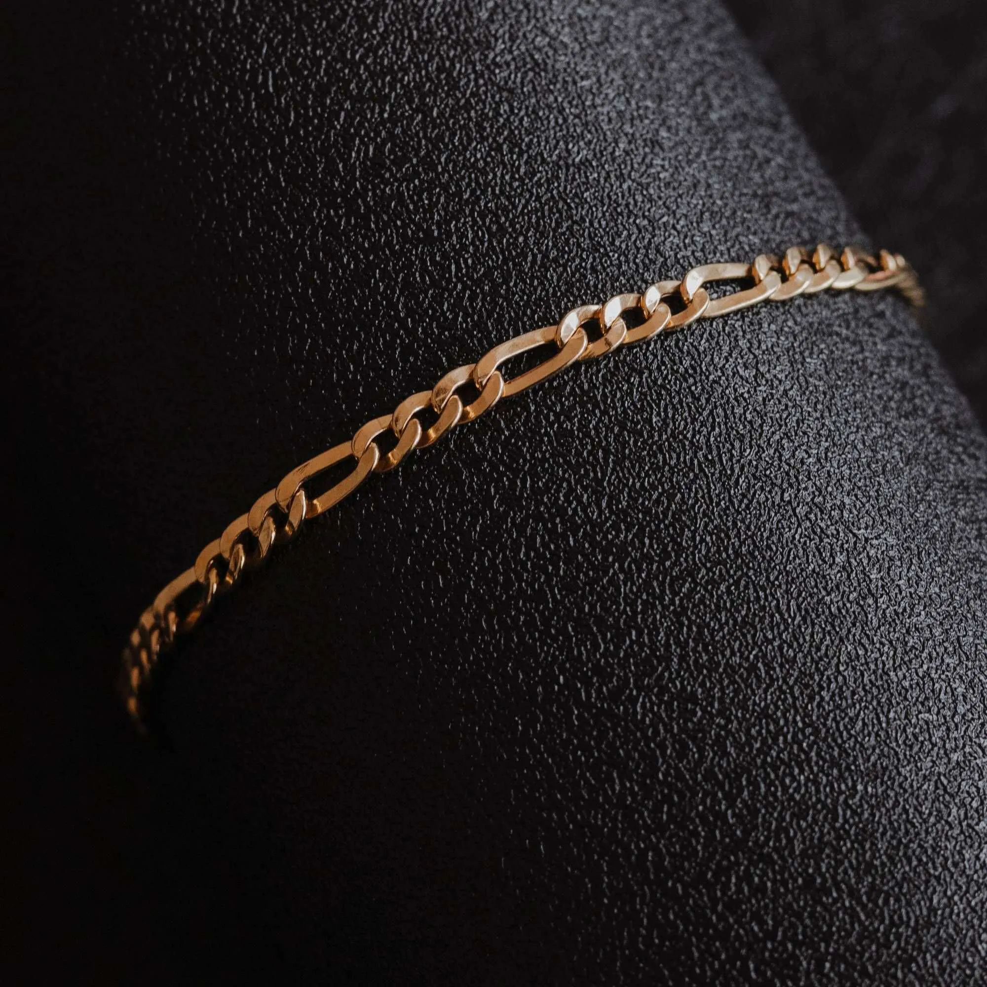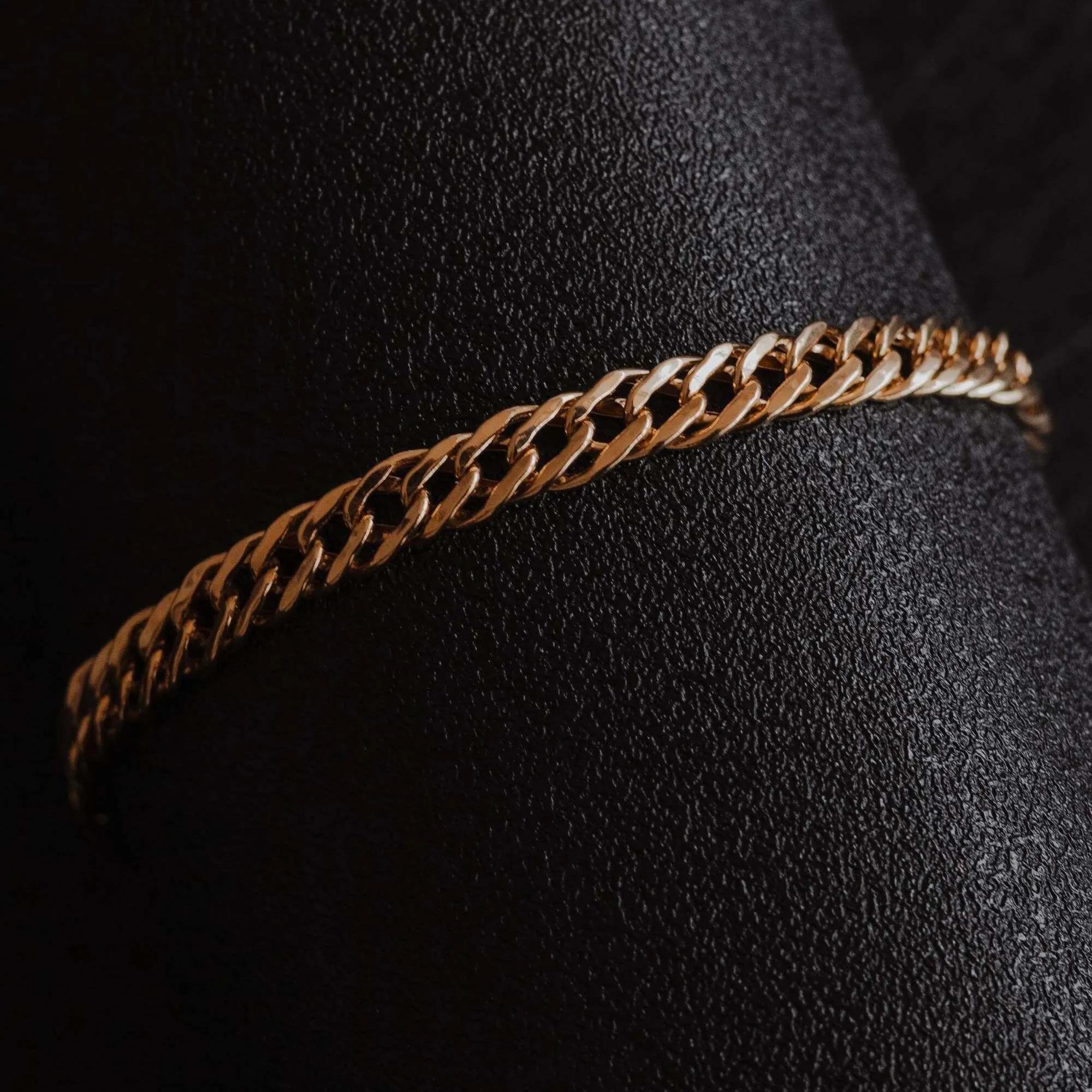 Esse modelo é formado por elos que se encaixam entre si e deixam pouco espaço vago, tornando a pulseira fina e elegante.