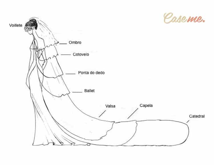 O véu capela passa um pouco da cauda do vestido, chegando aos 2 metros de comprimento, no máximo.