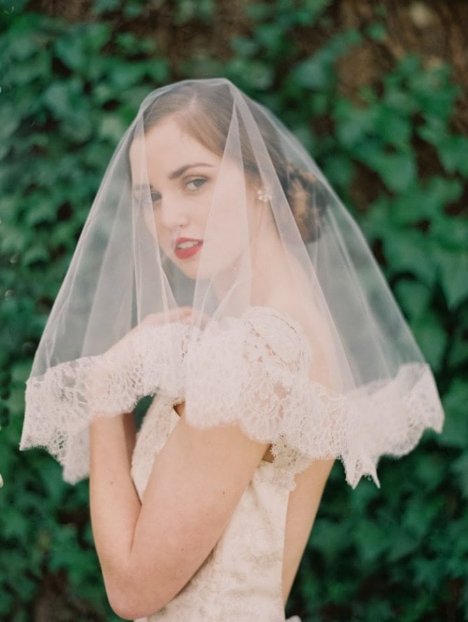 É o véu mais curto. Dependendo da sua escolha, ele pode cobrir só seus olhos, chegar na altura do seu nariz ou até seu queixo.