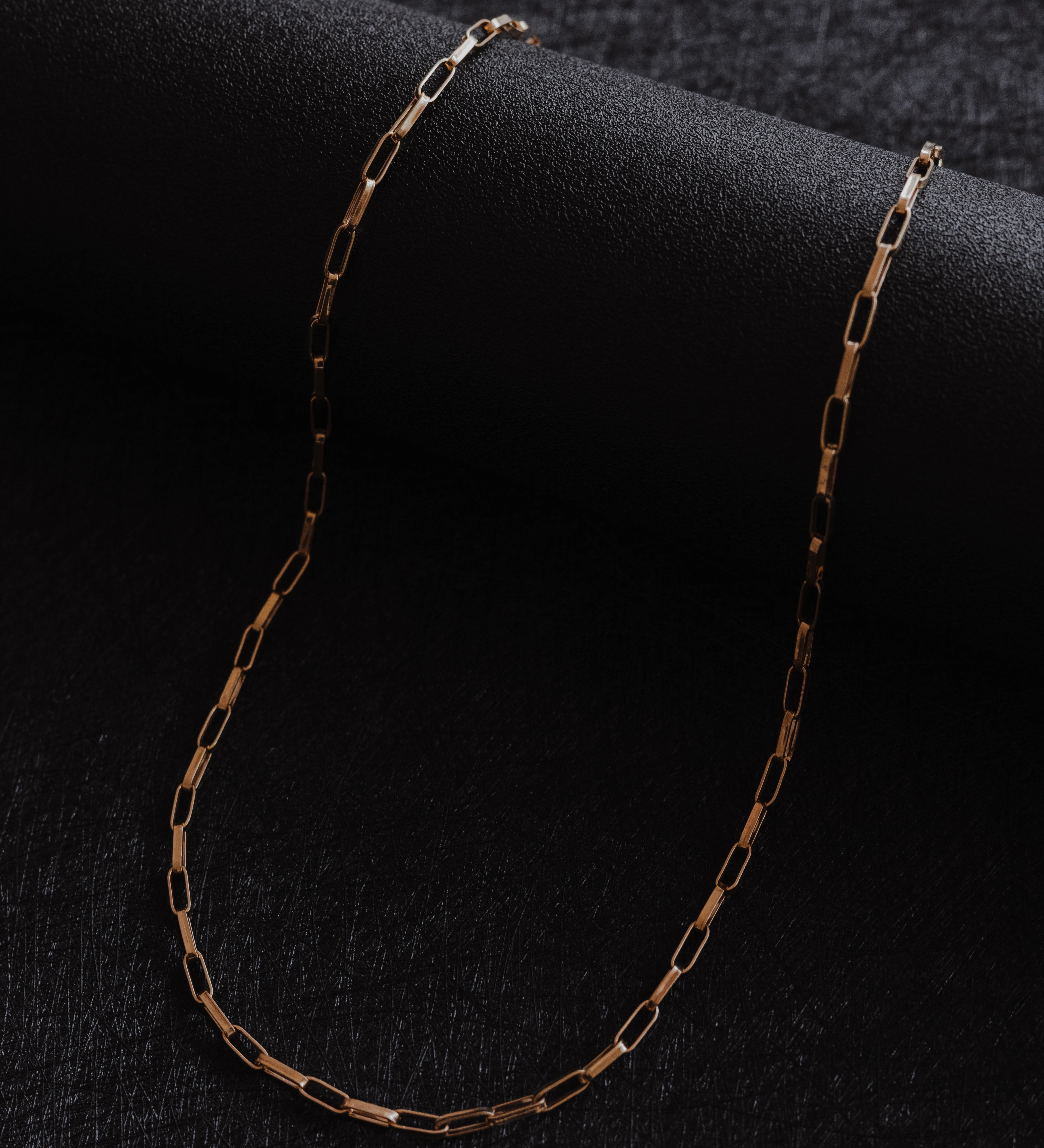 O formato dos elos da corrente Cartier são retangulares. Esse formato contribui para que a malha da joia fique uniforme e deixe um caimento bonito.